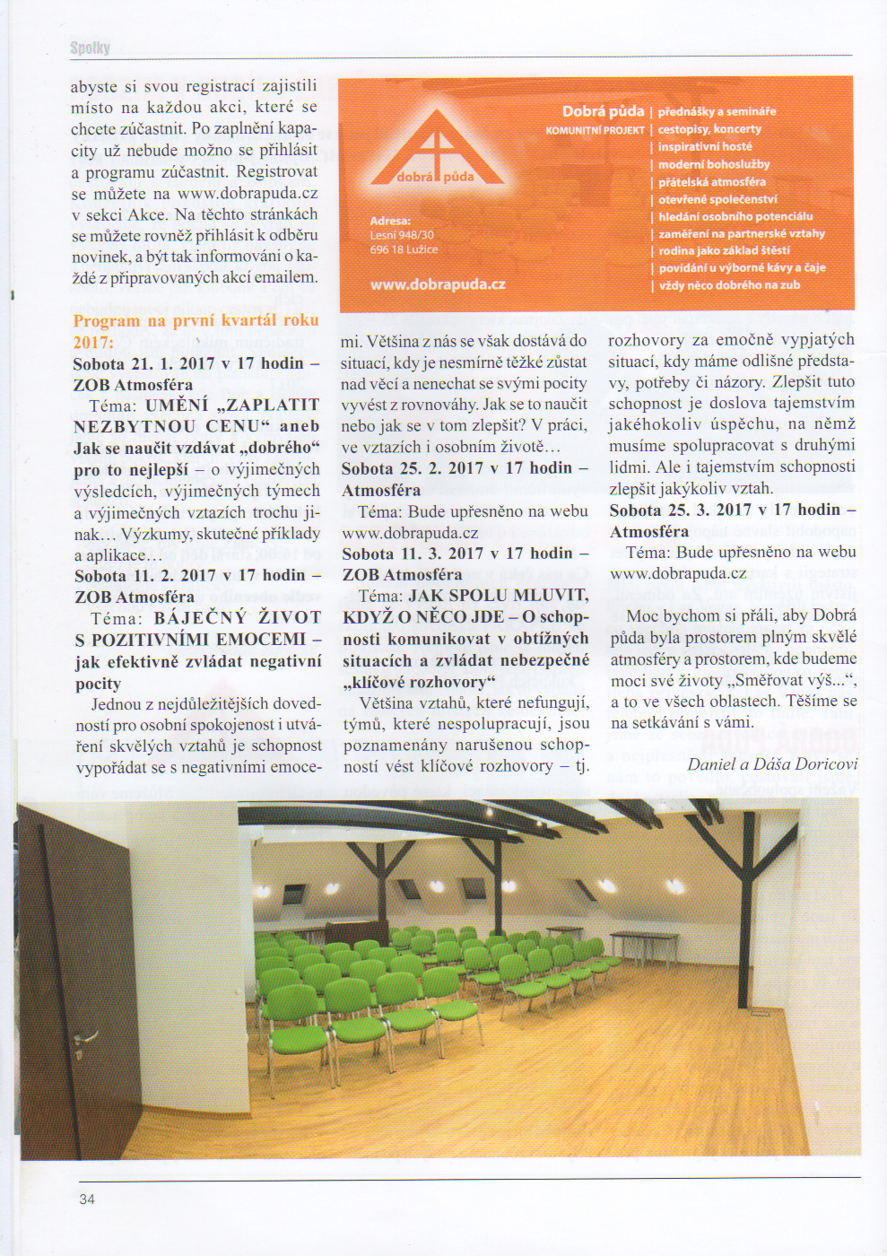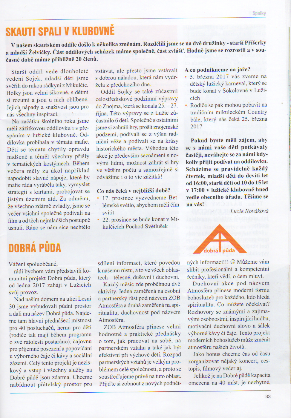 O komunitním projektu Dobrá půda, vyšel článek v Lužickém zpravodaji a jsme moc rádi, že tak Lužičtí občané dostali informaci o tomto zcela novém a věříme, že velmi zajímavém projektu přímo do svých schránek. V Lužickém zpravodaji se v každém čísle budou objevovat aktuální informace o dění na Dobré půdě. Těšíme se na setkání s Vámi při všech akcích.